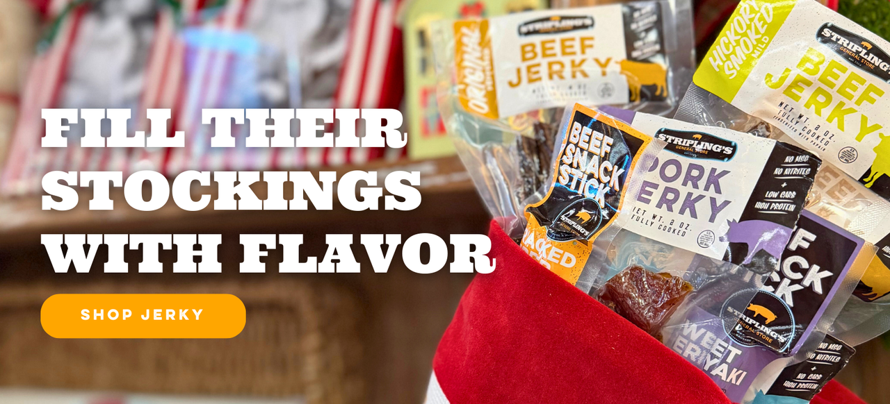 From our custom cut meats, to our southern specialties, to our rustic building design, this family business is steeped in tradition. Stop by for some famous Stripling’s sausage, take home a handful of our delicious jerky for the family, or just browse the store when you’re passing through.